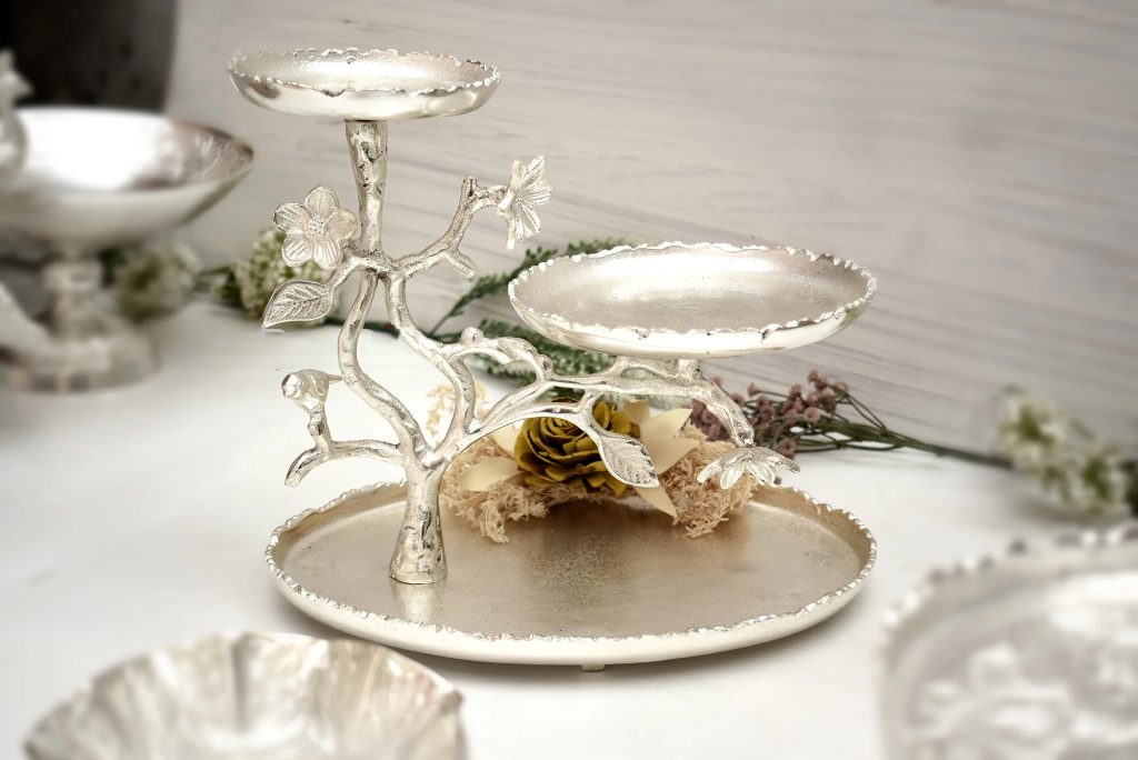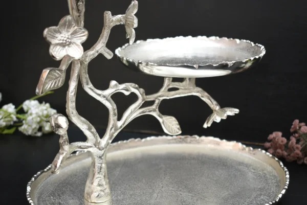 Orchid tree 3-Tier Metal Platter – a handcrafted masterpiece inspired by nature with floral and branch detailing.